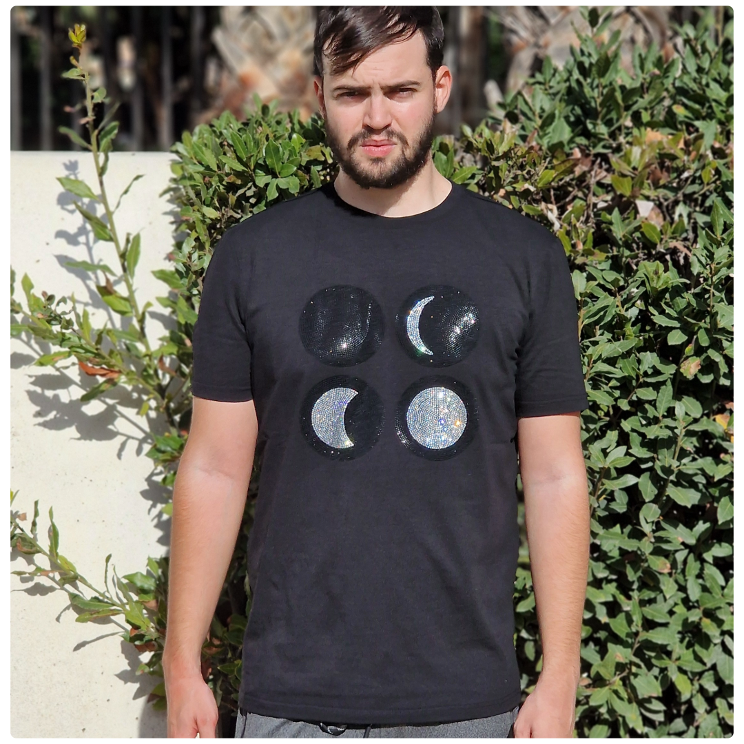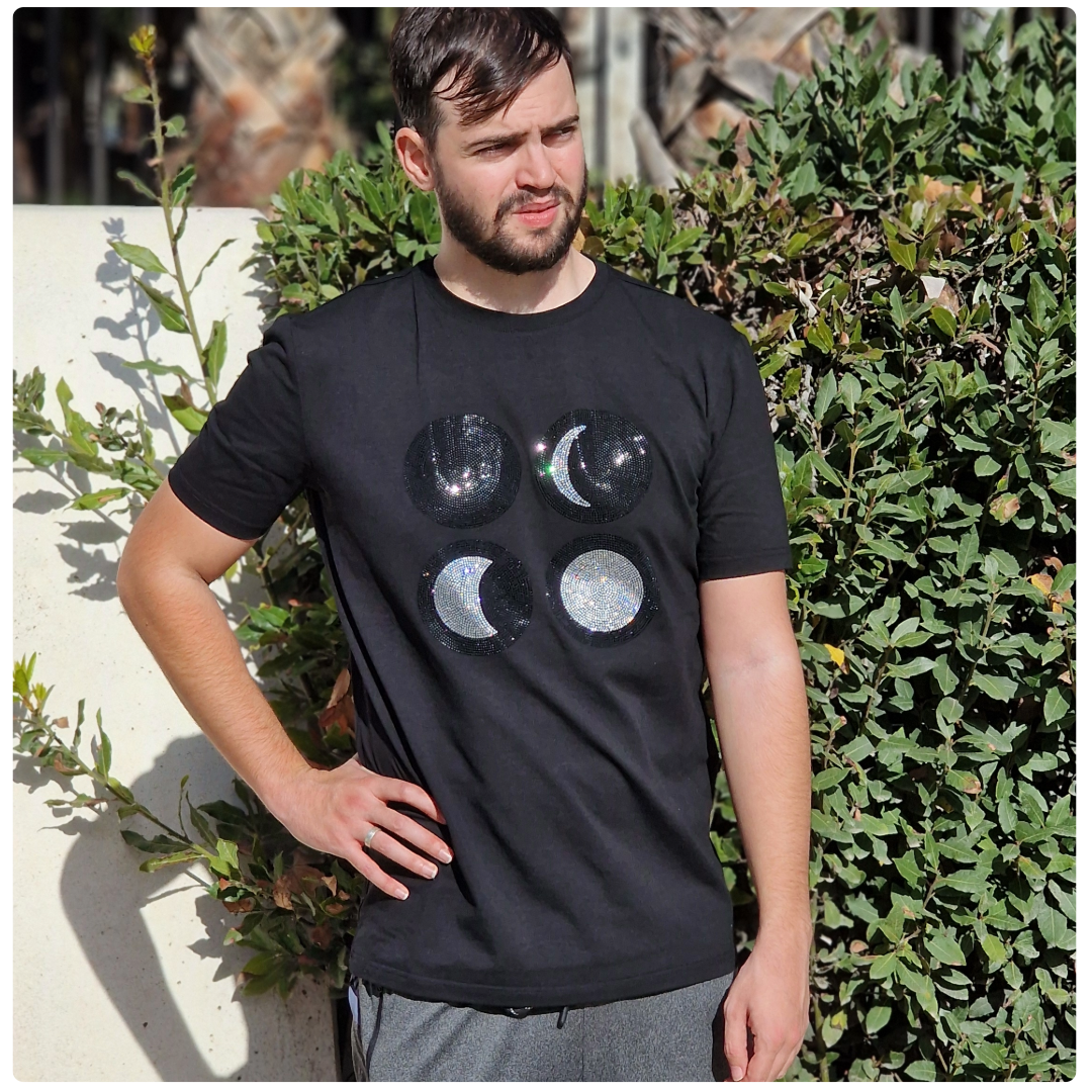 Embrace the celestial charm with our stunning Lunar Glamour T Shirt, featuring the four mesmerizing phases of the moon intricately designed with black and white rhinestones. Each phase, new moon, crescent, half moon, and full moon, shimmers with elegance, capturing the timeless beauty of the night sky. Perfect for adding a touch of cosmic sophistication to your wardrobe, this unique piece combines artistry and style, making it a standout for any occasion. Whether you're a lover of astronomy, fashion, or both, this T shirt is your gateway to celestial allure. Shine bright under the moonlight!