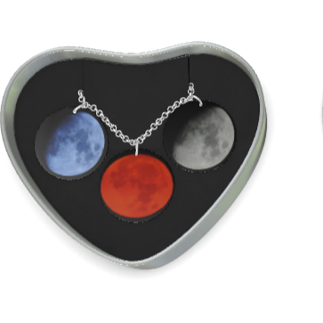 Trilogy Blue, Red, Gray Moon Necklace 18" sterling silver belcher chain Three 2.25cm sterling silver pendant discs Handmade by expert jewellers Presented in a heart-shaped tin Sustainably printed with eco-friendly inks Care instructions Wipe or polish gently with a soft lint free cloth.